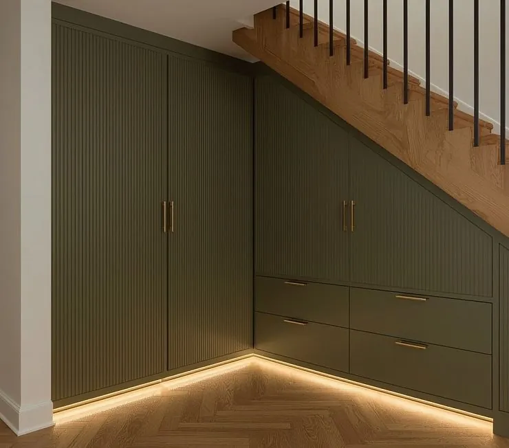 Элегантный встроенный шкаф под лестницей, выполненный в оливковом оттенке с вертикальным рифлением фасадов. Дополнен вместительными выдвижными ящиками и аккуратными латунными ручками. Встроенная LED-подсветка по периметру основания создаёт уютную атмосферу и подчёркивает современный стиль.