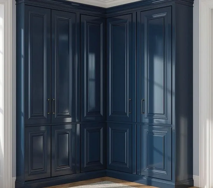 Роскошный угловой шкаф в глубоком сапфирово-синем цвете с глянцевым покрытием. Классические филенчатые фасады в сочетании с богатой цветовой гаммой придают интерьеру статусность и утонченность. L-образная конструкция позволяет максимально эффективно использовать угол помещения, создавая обширное пространство для хранения одежды, обуви и аксессуаров.