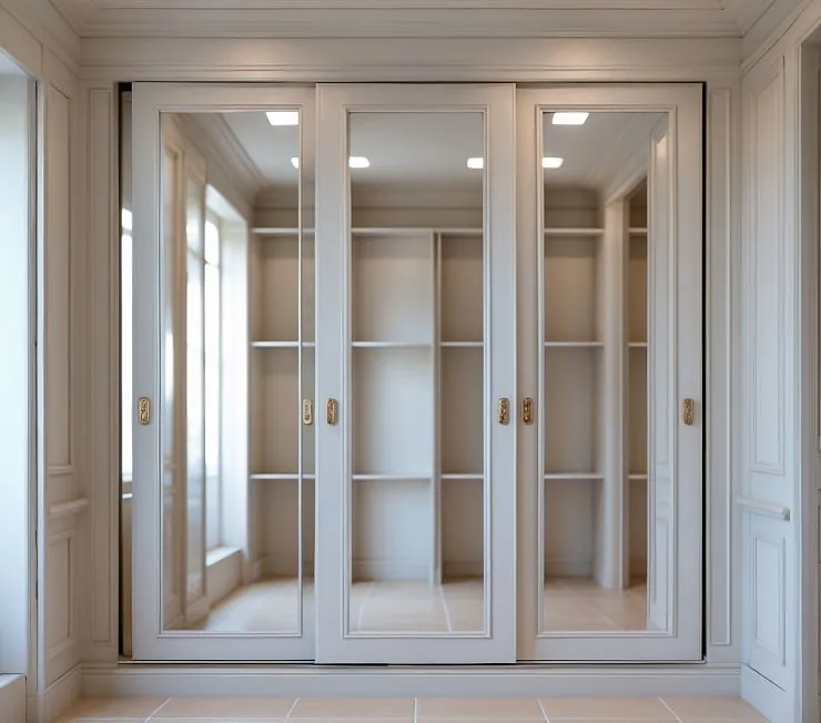Классический встроенный шкаф-купе с зеркальными фасадами и резными рамками
