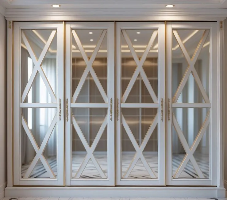Versailles — воплощение королевской элегантности в классическом интерьере. Четырёхдверный встроенный шкаф-купе с зеркальными фасадами, декорированными изящной перекрёстной расстекловкой и золотистыми элементами. Этот шкаф не просто функционален — он становится украшением комнаты.