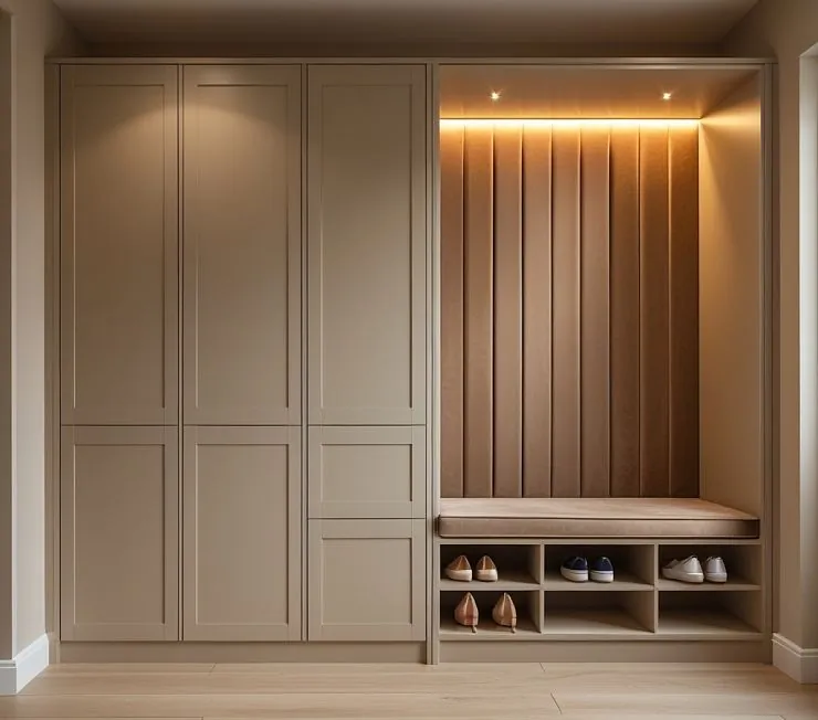 Элегантная встроенная прихожая в классическом стиле с фасадами в бежевом оттенке и мягким сиденьем, обитым велюром. Вертикальная панель в зоне сидения с мягкой обивкой создаёт атмосферу комфорта, а встроенная LED-подсветка придаёт интерьеру уют и современный штрих. Вместительный шкаф с фасадами в рамочном стиле обеспечивает достаточно места для хранения одежды и аксессуаров, а открытые обувные ниши под сиденьем помогают поддерживать порядок в прихожей.