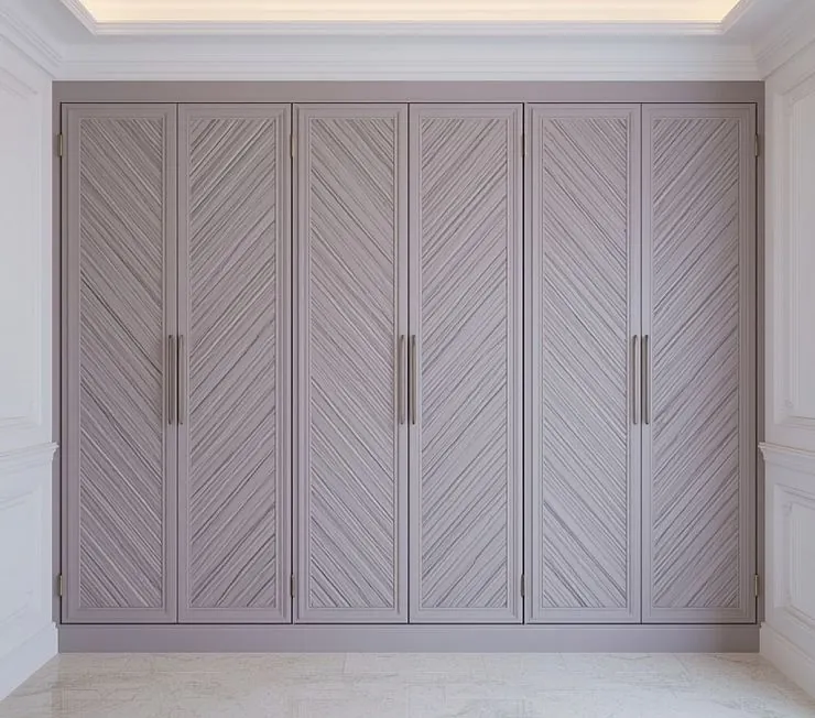 Элегантный встроенный шкаф в стиле арт-деко, выполненный в благородном оттенке пыльной сирени. Фасады украшены диагональной фрезеровкой, создающей динамичный визуальный ритм. Длинные вертикальные ручки подчёркивают высоту и утонченность конструкции. Идеально подойдёт для интерьеров в стиле неоклассика, модерн и contemporary.