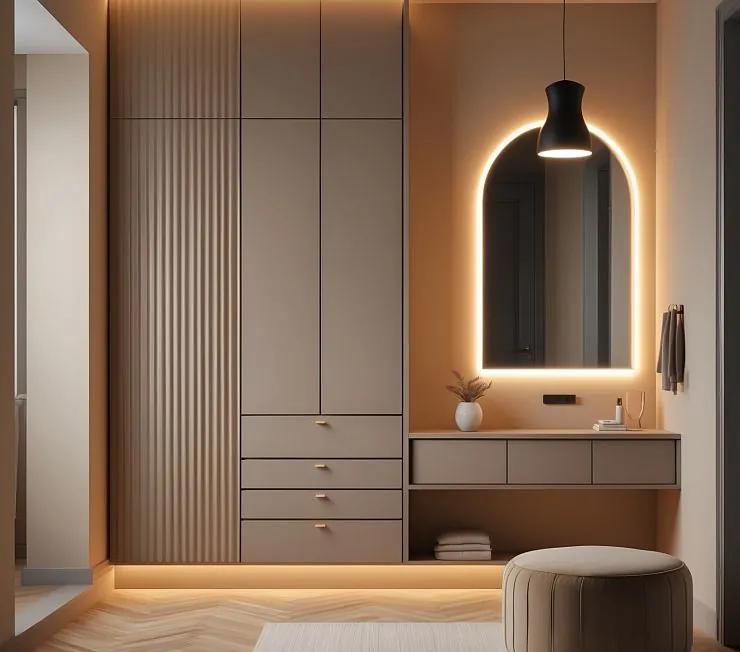 Элегантная прихожая в современном стиле, выполненная в теплой бежево-коричневой гамме. Левая часть представлена высоким шкафом с комбинированными фасадами — гладкими и рельефными вертикальными планками. В центральной секции расположены выдвижные ящики с золотистыми ручками. Справа — подвесная тумба с тремя ящиками и открытой нишей, над которой расположено большое арочное зеркало с мягкой светодиодной подсветкой по периметру. Композицию дополняет стильный подвесной светильник и мягкий круглый пуф. Подсветка в цоколе создает эффект парящей мебели.