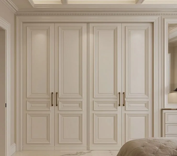 Роскошный встроенный шкаф с распашными дверцами, украшенными элегантной фрезеровкой в классическом стиле. Кремовый оттенок гармонично сочетается с латунными ручками и архитектурными элементами интерьера. Идеальное решение для спален в неоклассическом или дворцовом стиле.