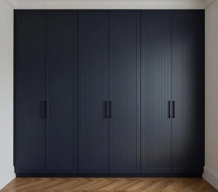 Современный встроенный шкаф с шестью распашными дверьми, оформленными в насыщенном тёмно-синем оттенке с рифлёной вертикальной текстурой. Контрастные чёрные ручки подчеркивают графичность дизайна. Идеален для интерьеров в стилях минимализм, модерн или неоклассика. Создаёт стильный акцент и при этом остаётся функциональным решением для хранения.