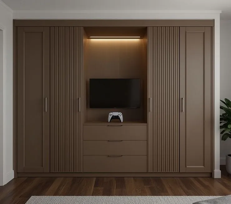 Элегантный встроенный шкаф в оттенке тёплого мокко с центральной нишей под телевизор и игровой консоль. Вертикальные фрезерованные панели по бокам добавляют объём и фактуру фасаду. Внизу расположены три вместительных выдвижных ящика, а по бокам — распашные дверцы с длинными металлическими ручками. Подсветка ниши создаёт атмосферный акцент в интерьере.