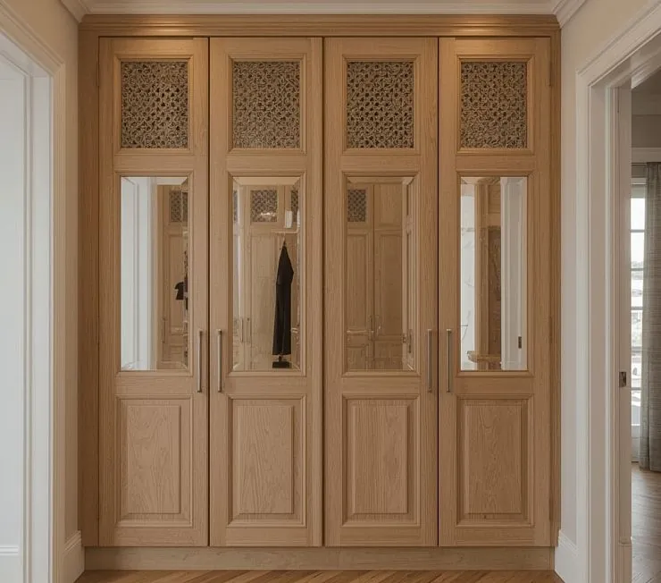 Элегантный встроенный шкаф из натурального ясеня с четырьмя распашными дверцами, оснащёнными большими зеркальными вставками. Верхняя часть дверей украшена декоративными резными панелями, что придаёт изделию утончённость и благородный вид. Просторное внутреннее наполнение подойдёт для хранения одежды и аксессуаров.