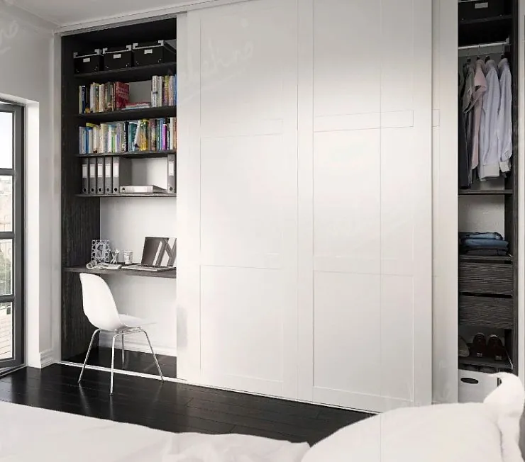 Практичная и продуманная до мелочей модель, включающая зону для расположения компьютера или работы с бумагами. Корпус - высококачественная ЛДСП, фасады - МДФ в эмали. Стильная и максимально надежная система купе на алюминиевой раме. Направляющие и выдвижные ящичные системы - от австрийского бренда “Блюм”. Эксклюзивное изготовление в различных размерах, под заказ.