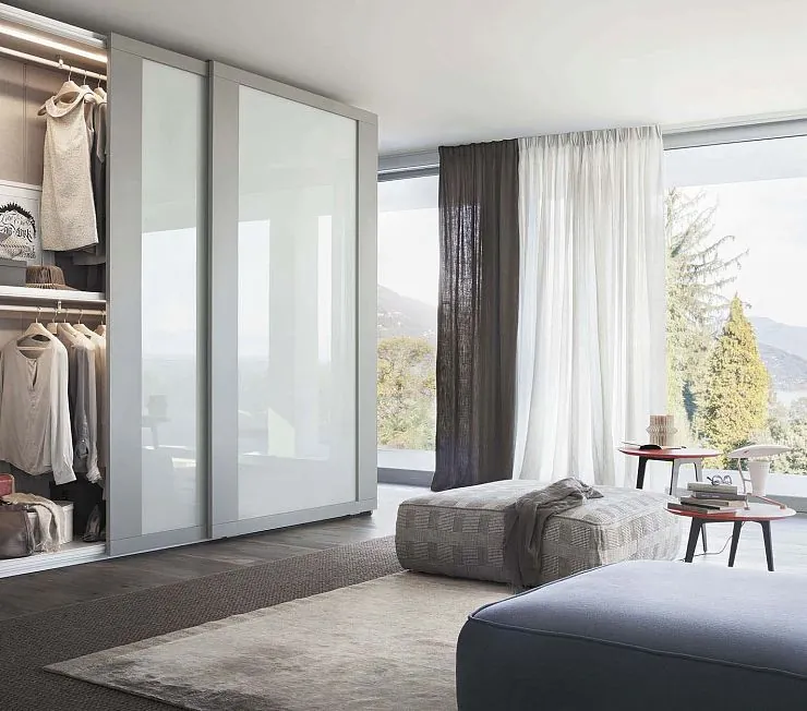 Предназначен для гардеробных. Из ЛДСП. Фасад из матовой древесно-волокнистой плиты ЭМАЛЬ и стекла в пленке (возможна установка зеркал).