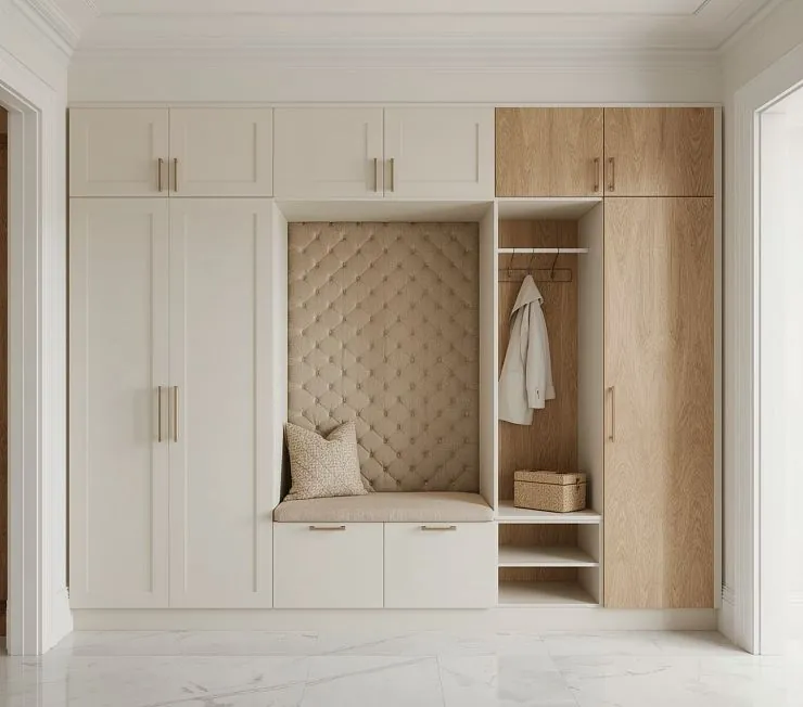 Современный встроенный шкаф для прихожей, сочетающий закрытые секции для хранения и декоративную мягкую нишу с объемной стеганой спинкой. Выполнен в светлых тонах с элементами под натуральный дуб. В конструкции предусмотрено: закрытые шкафы для одежды и обуви, мягкая зона для сидения с подушкой и декоративной стеганой обивкой, открытая секция с полками и штангой для верхней одежды, верхние антресоли для сезонных вещей.