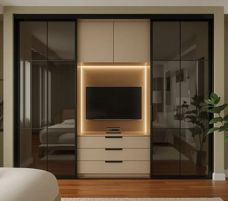 Современный встроенный шкаф-купе с центральной нишей для телевизора, оформленной стильной контурной LED-подсветкой. Боковые секции оснащены раздвижными дверями с тонированным стеклом в чёрной рамке, что придаёт конструкции лёгкость и утончённость. В нижней части ниши расположены три вместительных выдвижных ящика, а сверху – аккуратные антресоли для хранения. Минималистичный дизайн, комбинация бежевых и чёрных оттенков и мягкое освещение создают атмосферу премиального интерьера.