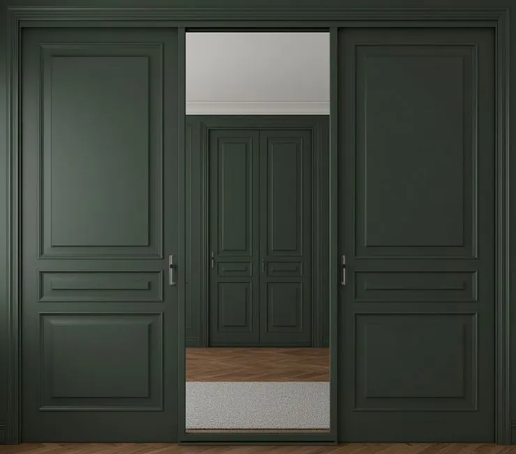Элегантный встроенный шкаф-купе с тремя створками: две боковые выполнены в классическом стиле с рамочными фасадами насыщенного тёмно-зелёного оттенка, а центральная — полностью зеркальная. Такое решение делает шкаф не только функциональным, но и визуально расширяет пространство комнаты. Аккуратные тёмные ручки дополняют общий минималистичный и благородный образ.