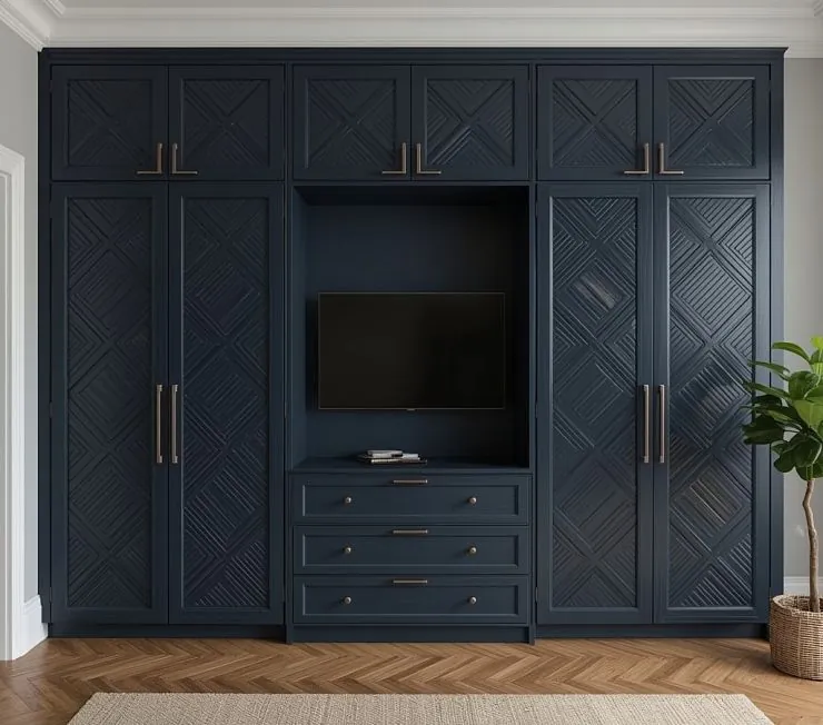 Стильный встроенный шкаф глубокого синего цвета с уникальной геометрической фрезеровкой на фасадах. Центральная ниша предназначена для телевизора, под ней расположены три просторных выдвижных ящика с изящной фурнитурой. Верхняя часть оснащена антресолями для дополнительного хранения. Контрастные металлические ручки подчёркивают современный и премиальный стиль мебели, создавая акцент в интерьере спальни или гостиной.