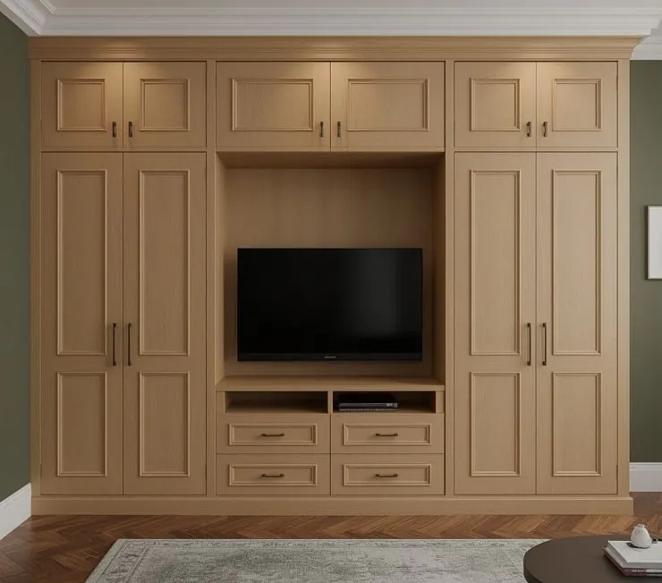 Классический встроенный шкаф из светлого дуба с симметричной композицией фасадов. Центральная ниша предназначена для телевизора, под которой расположены четыре выдвижных ящика и две открытые полки для техники или аксессуаров. Боковые секции с распашными дверцами и верхние антресоли обеспечивают максимальное использование пространства для хранения. Аккуратная фрезеровка и тёплый древесный оттенок создают уютную и элегантную атмосферу в интерьере.
