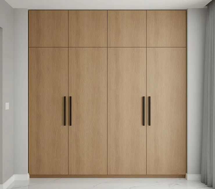 Минималистичный встроенный шкаф с фасадами из панели в натуральном дубовом декоре. Вертикальные чёрные ручки создают стильный контраст, а лаконичный дизайн гармонично вписывается в современный интерьер. Предусмотрено максимальное использование внутреннего пространства для хранения одежды, белья и аксессуаров.