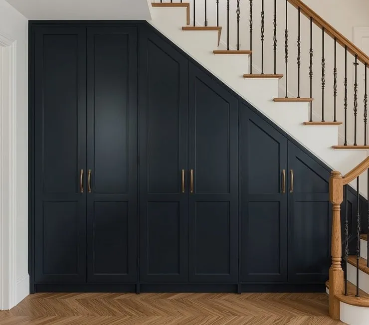 Элегантный шкаф, изготовленный на заказ для установки под лестницей. Диагональные фасады с рамочными филёнками подчёркивают форму марша, а матовое тёмно-синее покрытие и изящные латунные ручки придают интерьеру благородный характер. Идеальное решение для хранения обуви, одежды или бытовых принадлежностей.