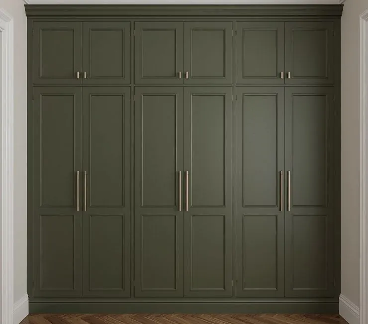 Шкаф встроен по всей ширине стены и оформлен в спокойном тёпло-зелёном цвете. Фасады — классические, с прямоугольной фрезеровкой и аккуратными пропорциями. Высокие ручки под бронзу создают вертикальный ритм и подчёркивают элегантность. Потолочный плинтус завершает образ и связывает шкаф с архитектурой помещения.