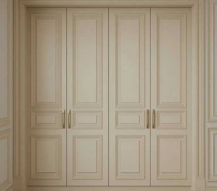 Изысканный встроенный шкаф с четырьмя распашными фасадами и объёмными классическими филёнками. Выполнен в тёплом кремовом цвете, гармонирующем с лепниной и молдингами классического интерьера. Идеально вписывается в архитектурные ниши. Высококачественная фурнитура с матовым металлическим покрытием придаёт образу завершённость. Возможна индивидуальная планировка внутреннего наполнения: штанги, ящики, подсветка.
