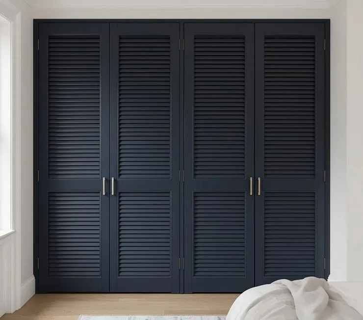 Современный встроенный шкаф до потолка с четырьмя распашными створками. Все фасады оформлены горизонтальными ламелями (решётками), обеспечивающими вентиляцию. Цвет — глубокий тёмно-синий с матовой отделкой. Ручки — прямоугольные, металлические, с вертикальной ориентацией. Шкаф интегрирован в нишу спальни с белыми стенами и светлым паркетом.