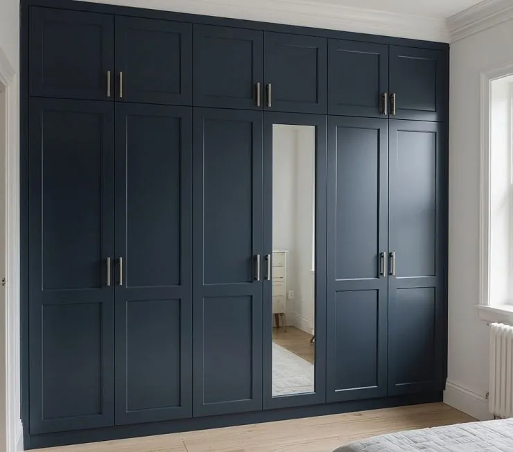 Элегантный встроенный шкаф с матовыми фасадами в насыщенном тёмно-синем оттенке. Стильные филёнчатые дверцы подчёркнуты современными металлическими ручками, а одна из центральных створок украшена встроенным зеркалом во весь рост — это визуально расширяет пространство и добавляет функциональности. Верхние антресоли обеспечивают дополнительное хранение. Идеальное решение для спальни в современном или неоклассическом стиле.