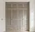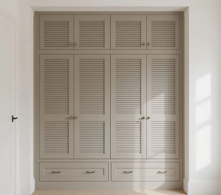 Полноценный встроенный шкаф до потолка с шестью створками и верхними антресолями. Все фасады выполнены с горизонтальными вентиляционными ламелями (решётками). Цвет — тёплый светло-бежевый, матовый. Внизу — три выдвижных ящика с металлическими ручками. Шкаф установлен в нише, пол покрыт натуральным ковролином.