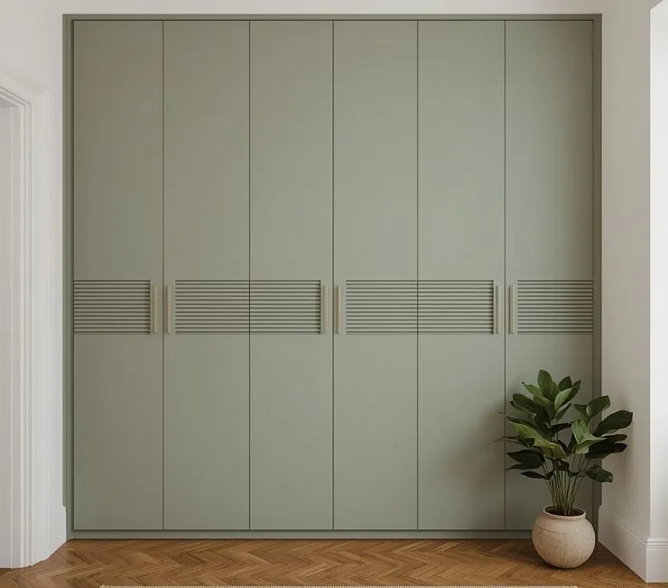 Современный и стильный встроенный шкаф с шестью распашными фасадами, выполненный в мягком оливковом оттенке. Особое внимание привлекают горизонтальные рифлёные вставки на уровне ручек — это не только эстетика, но и функциональный акцент, разделяющий фасады визуально. Шкаф гармонично впишется в интерьер с природными, тёплыми оттенками, минималистичным или скандинавским настроением.