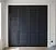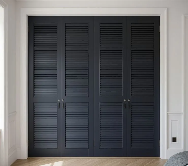 Элегантный встроенный шкаф с четырьмя распашными дверцами, выполненными в классическом жалюзийном стиле. Окрашен в глубокий тёмно-синий цвет. Шкаф встроен от пола до потолка в нишу с белыми стенами и декоративным карнизом. Фурнитура выполнена в виде лаконичных круглых ручек и тонких вертикальных скоб, подчеркивающих строгость дизайна. На полу — светлый паркет в ёлку.
