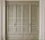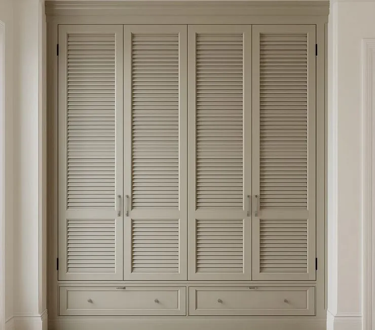 Классический встроенный шкаф с четырьмя распашными дверцами с горизонтальными жалюзи. Выполнен в светлом серо-бежевом оттенке, гармонирующем с нейтральным интерьером. В нижней части — три выдвижных ящика с декоративными рамками и аккуратной фурнитурой. Ручки прямоугольные, современного дизайна. Шкаф встроен от пола до потолка, в нишу с белыми стенами и лепниной.