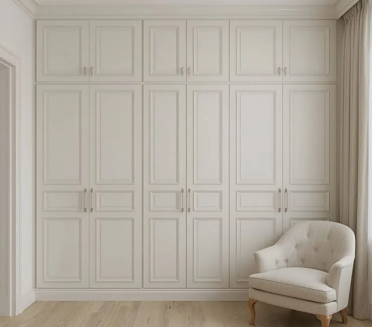 Элегантный встроенный шкаф-купе от пола до потолка выполнен в классическом стиле с фасадами в нежном сливочно-бежевом оттенке. Прямоугольные филёнки, латунные ручки и симметричная композиция подчёркивают утончённость и гармонию дизайна. Верхний уровень антресолей идеально подходит для хранения сезонных вещей и редко используемых предметов.