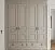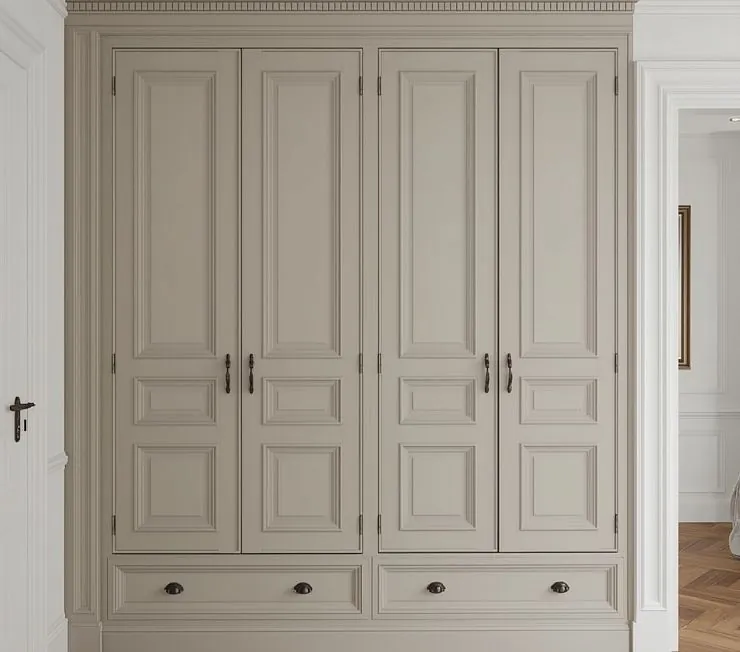 Шкаф оформлен в благородном серо-бежевом оттенке и полностью интегрирован в классическую нишу с молдингами и карнизом. Четыре распашные двери украшены объёмными филёнками, подчёркивающими симметрию. В нижней части — два выдвижных ящика с тёмными круглыми ручками. Основные ручки дверей — декоративные, с плавными изгибами.