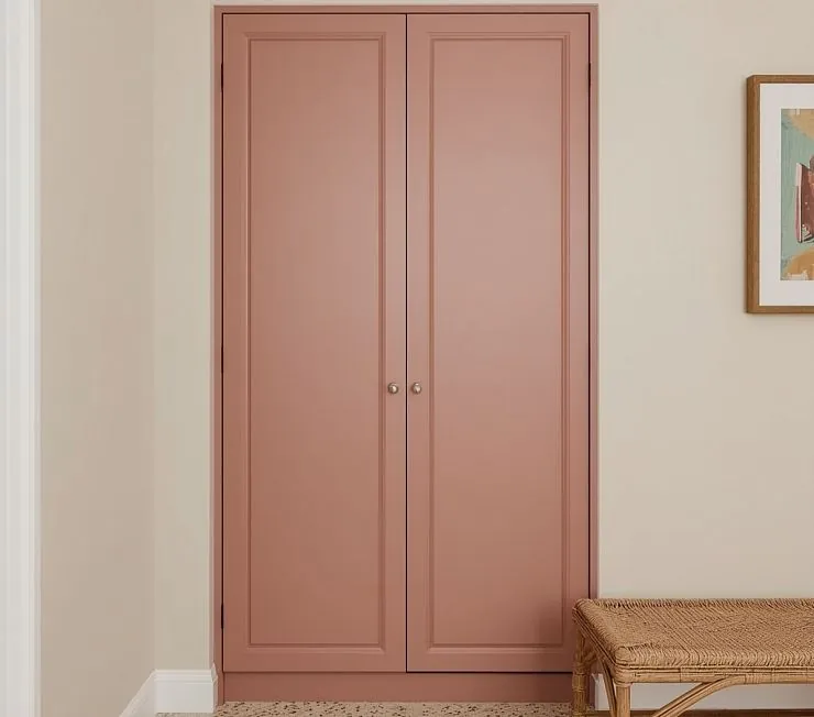 Стильный шкаф с распашными фасадами в оттенке пыльной розы. Эмаль матовая, нанесена на фасады из МДФ с утончённой рамочной фрезеровкой. Шкаф встроен в нишу и образует единое целое со стеной. Внутренняя комплектация настраивается под хранение одежды, обуви или аксессуаров. Фурнитура — Hettich или Blum.