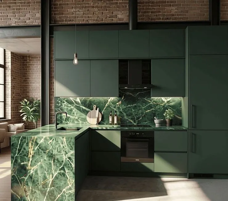 Впечатляющая столешница и фартук из искусственного камня с уникальным изумрудно-зелёным мраморным рисунком Verde Alpi становятся выразительным акцентом интерьера. Такой материал не только выглядит эффектно, но и отличается повышенной прочностью и легкостью в уходе. Светодиодная подсветка под верхними шкафами делает работу на кухне удобной и создаёт атмосферное освещение.